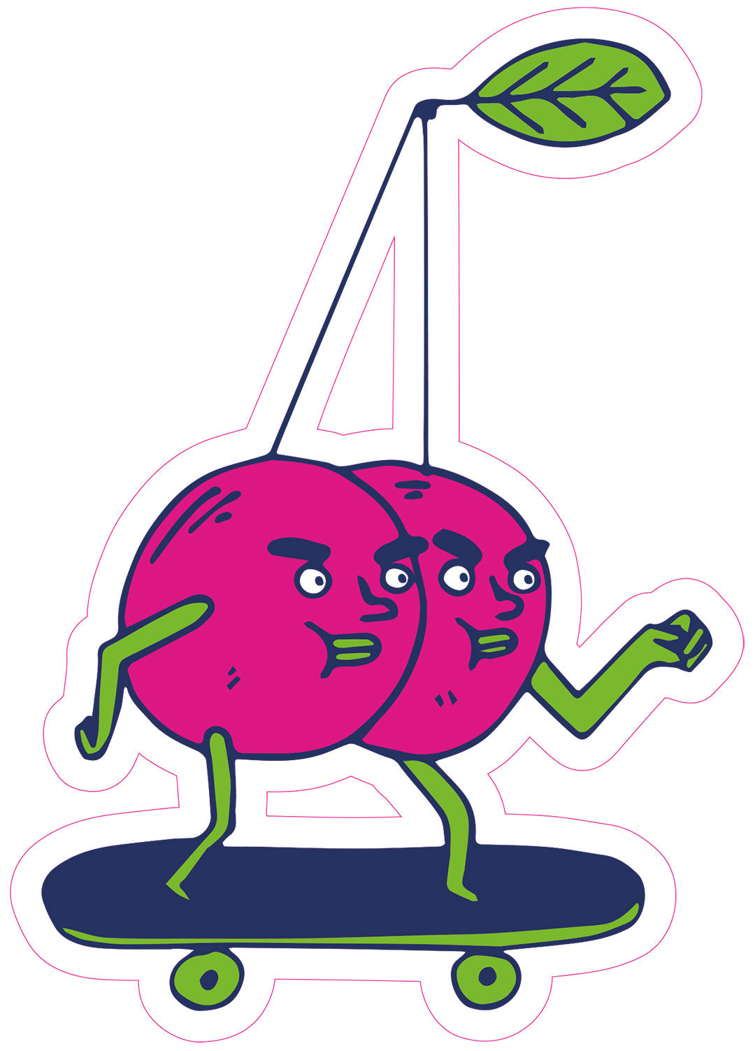 This ain't-a just a sticker – it's-a statement! Our crazy cherry twins riding a skateboard bring-a da rebellion to your laptop, board, or anywhere you want-a some Cherry attitude.